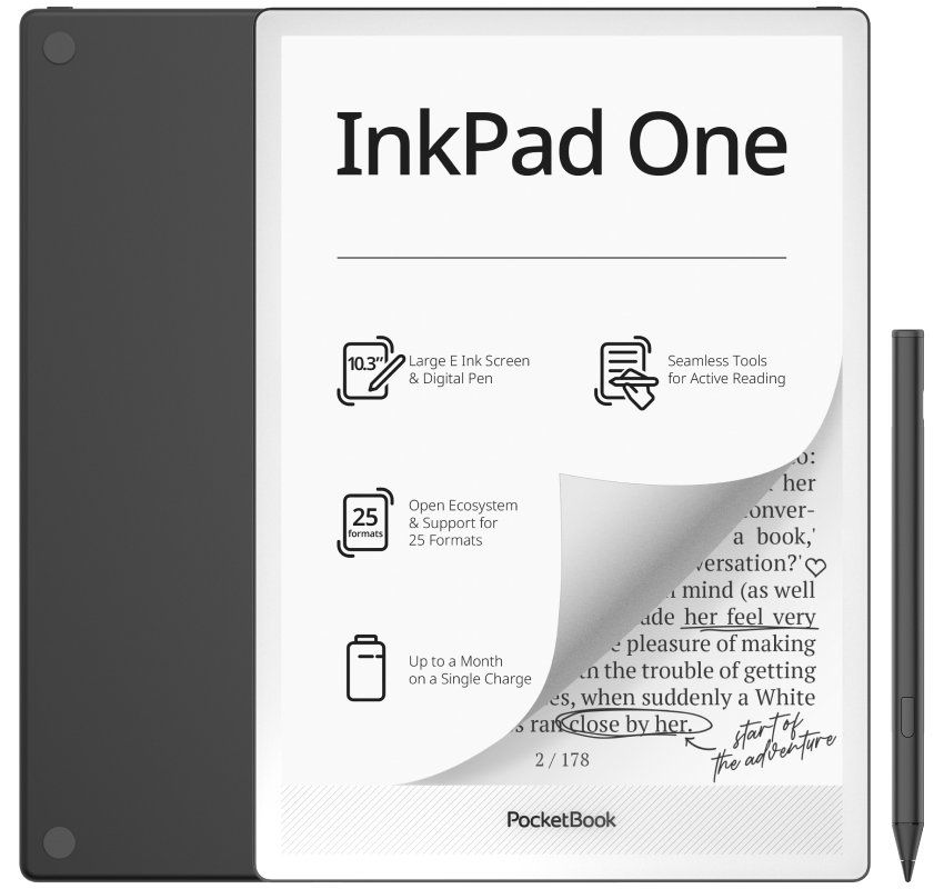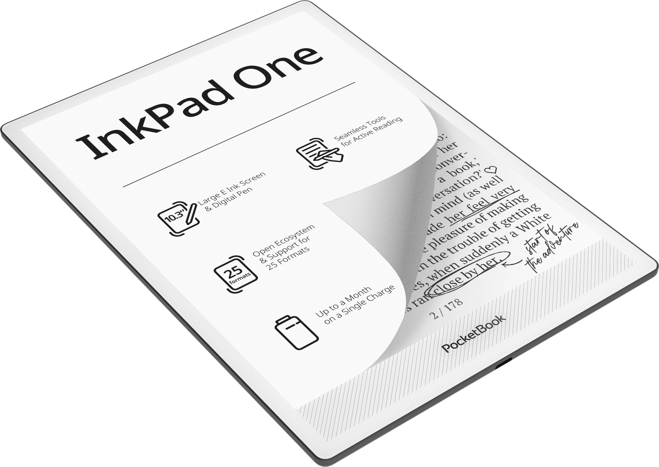 PocketBook lansează InkPad One, un nou e-reader de 10,3” cu pix Stylus, conceput pentru lectură activă și scris de mână confortabil. Dispozitivul dispune de un ecran cu aspect de hârtie E Ink Mobius™ și este furnizat împreună cu un pix digital pentru a putea lua notițe într-un mod natural, oferind o gamă vastă de instrumente încorporate pentru scrierea de mână. InkPad One reprezintă o soluție accesibilă cu ecran mare, ideală pentru lectură, scriere și productivitate zilnică.